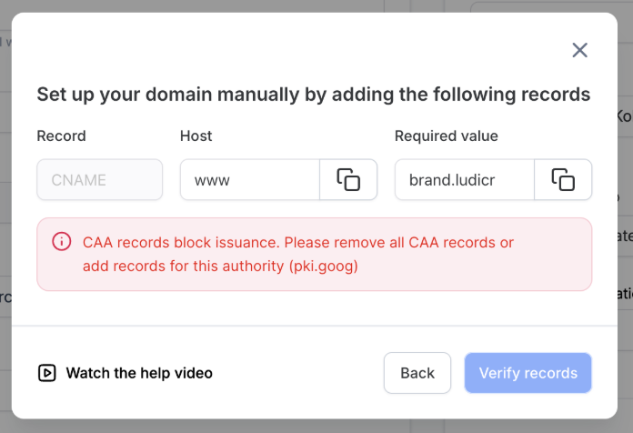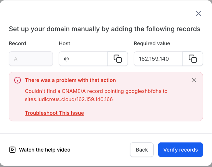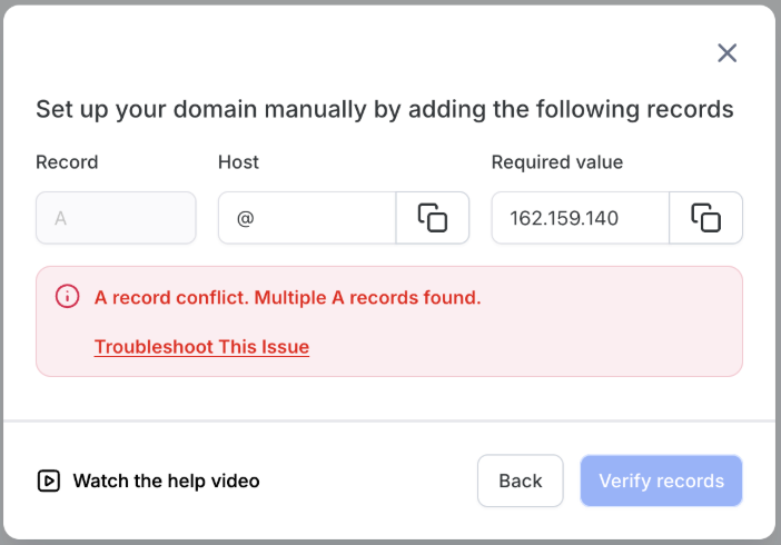 This error occurs when the DNS settings for your domain do not align with the platform’s requirements. This could be due to: