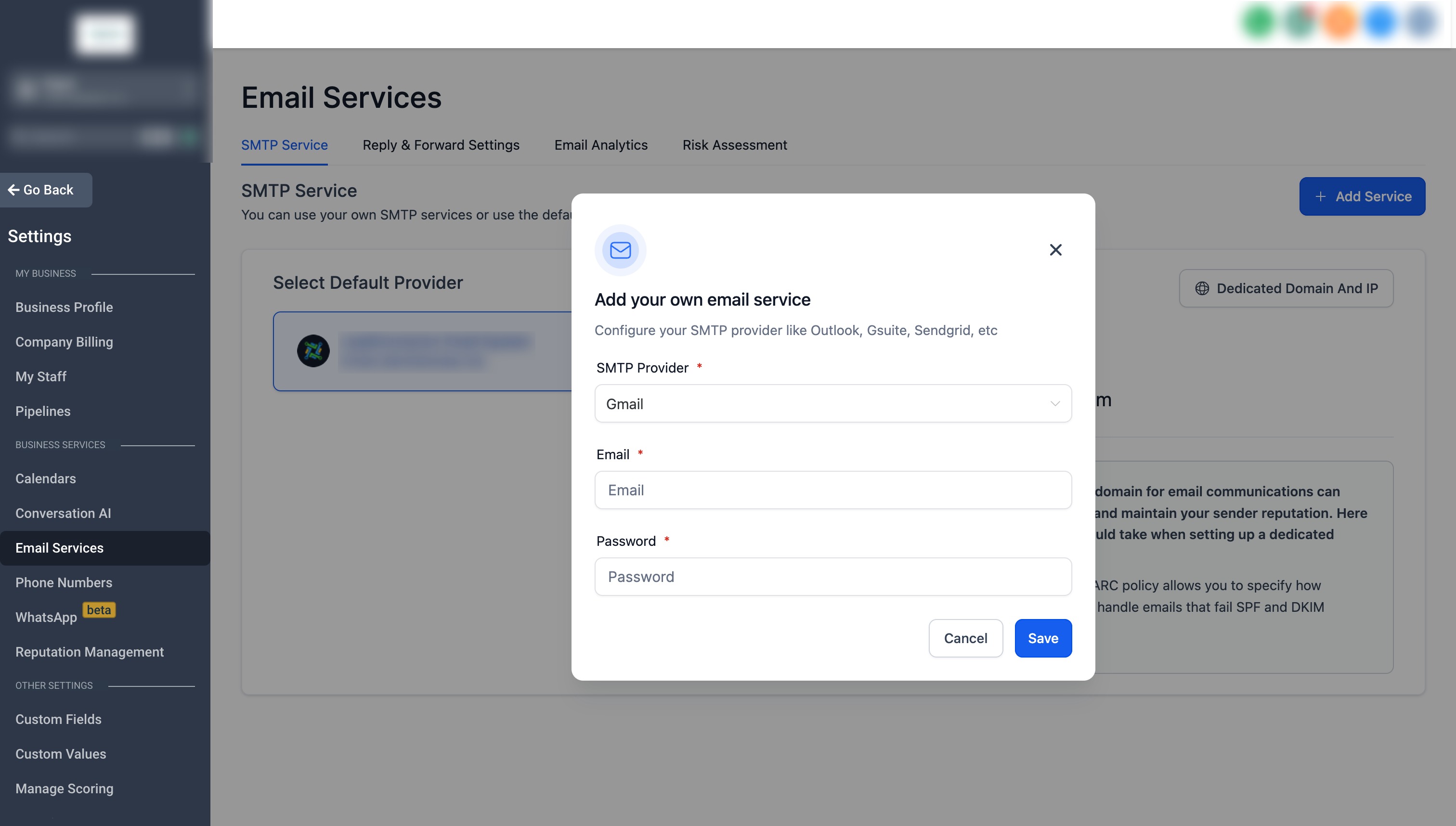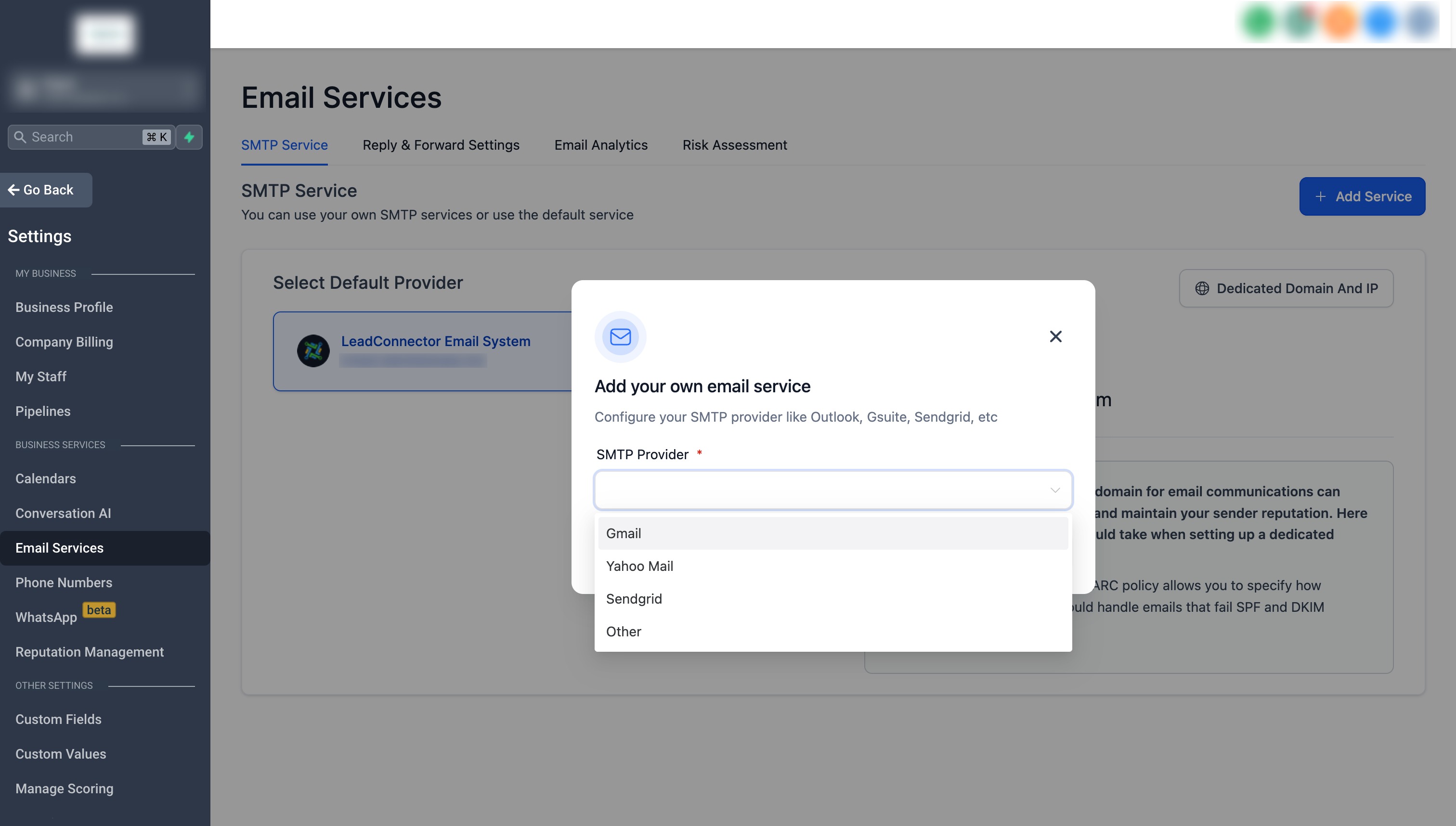 - Naviguez dans Paramètres -> Service de messagerie -> Service SMTP.