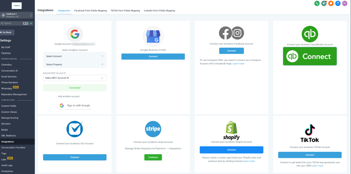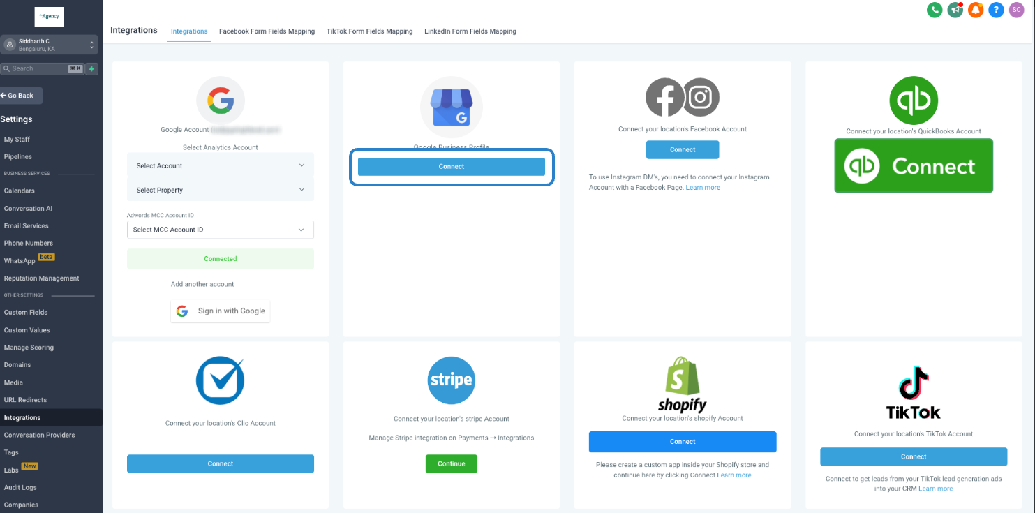 Pour relier vos pages de profil Google Business (GBP), rendez-vous sur la page Intégrations sous Paramètres du sous-compte. Accédez à la section Intégrations GBP.