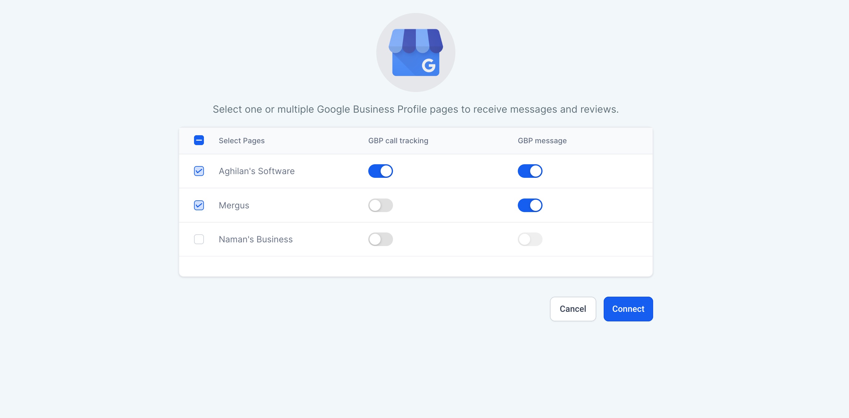 Connectez de manière fluide une ou plusieurs pages de profil Google Business à un sous-compte. En connectant plusieurs pages, vous obtiendrez la possibilité de visualiser, suivre et surveiller tous les actifs associés, tels que les messages, prospects et avis, au sein d'un seul sous-compte.