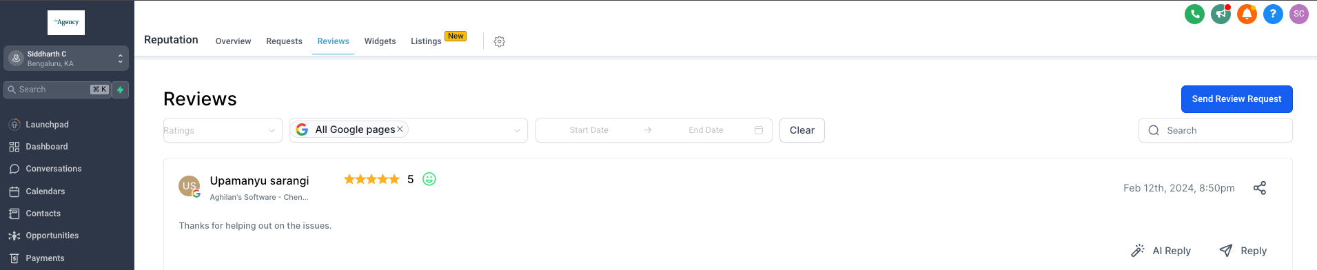 Lorsque vous recevez un avis d’un client, les données concernant les avis sont disponibles sur la page Avis sous le module Réputation. Ici, vous pouvez consulter, suivre et répondre aux avis reçus des pages Google Business connectées à votre sous-compte.