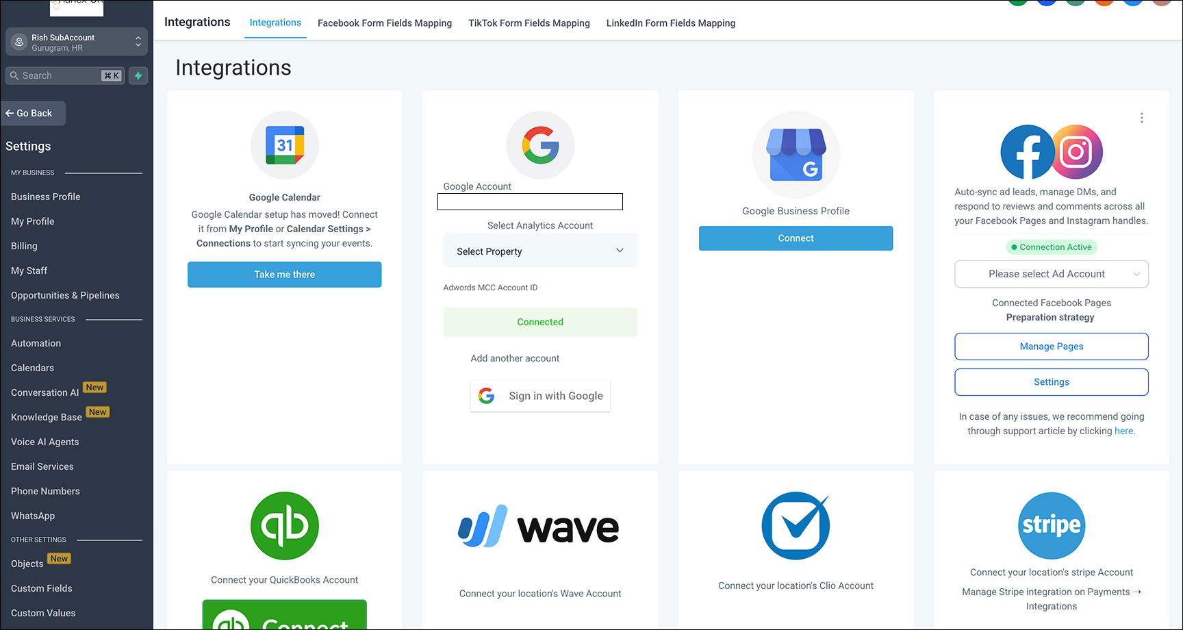 Étape 1 : Depuis la page du tableau de bord du sous-compte, sélectionnez les paramètres et accédez aux intégrations.