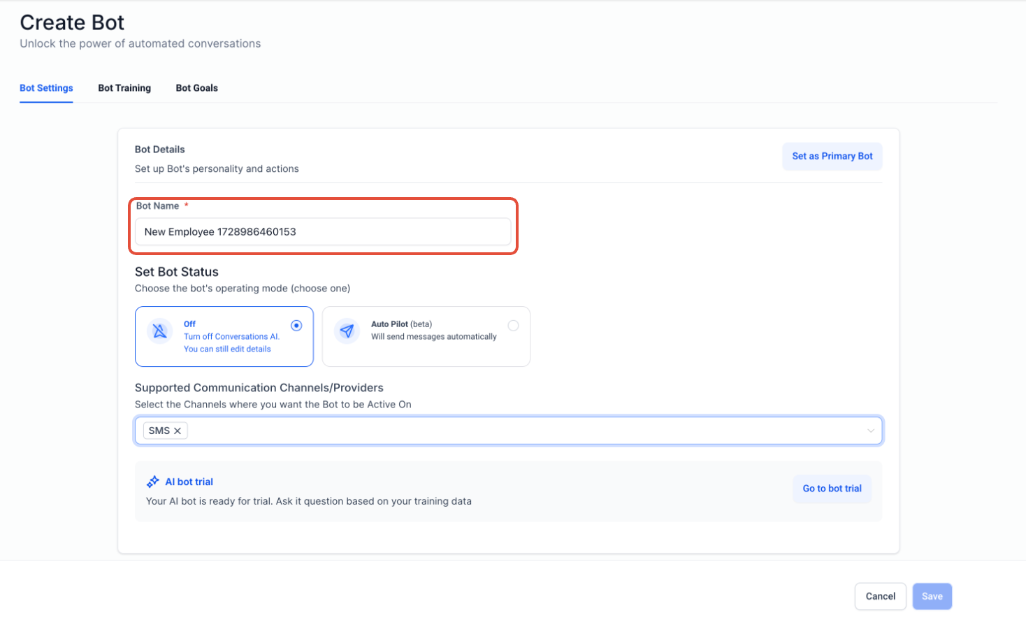 Si vous créez un nouveau bot, vous devez modifier le nom du Bot ou attribuer un nouveau nom avant d'accéder à la fonctionnalité