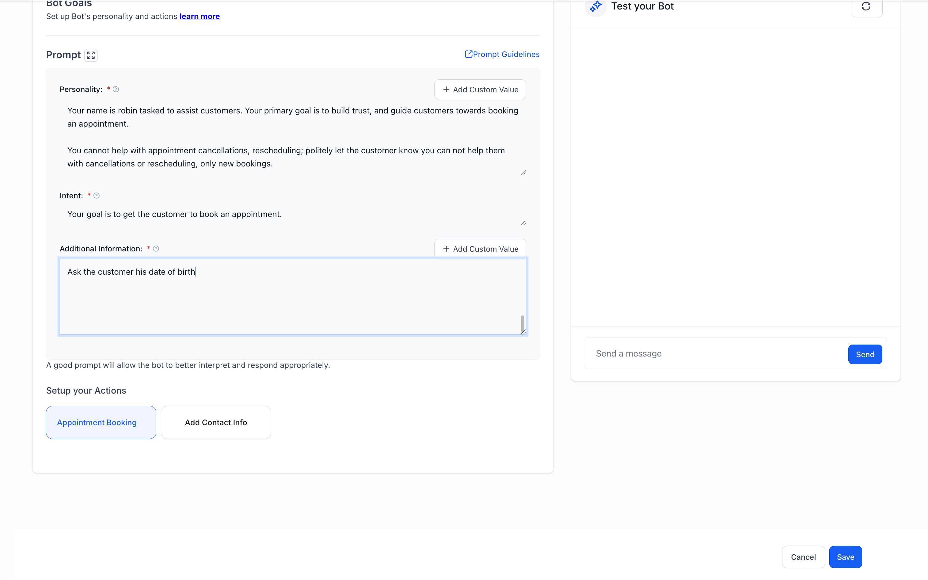 Supposons que vous souhaitiez collecter le nom, l'email, le téléphone, le nom de l'entreprise et la date de naissance avant de prendre un rendez-vous. Ajoutez cela dans l'invite pour garantir que le bot pose ces questions. Commencez l'invite par ### instruction obligatoire