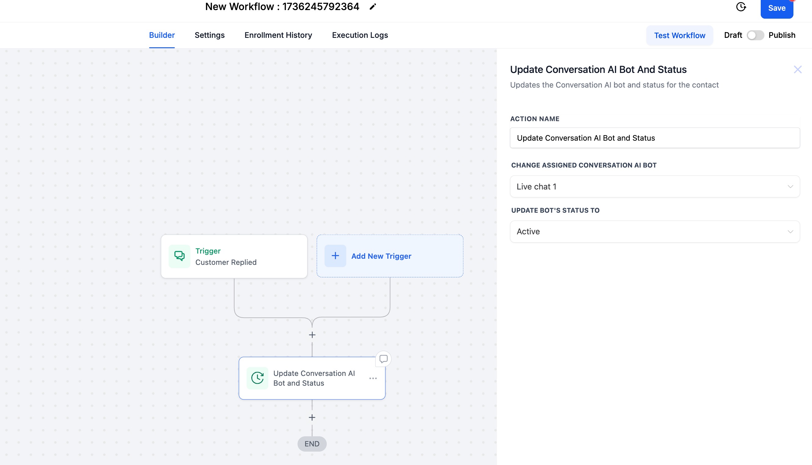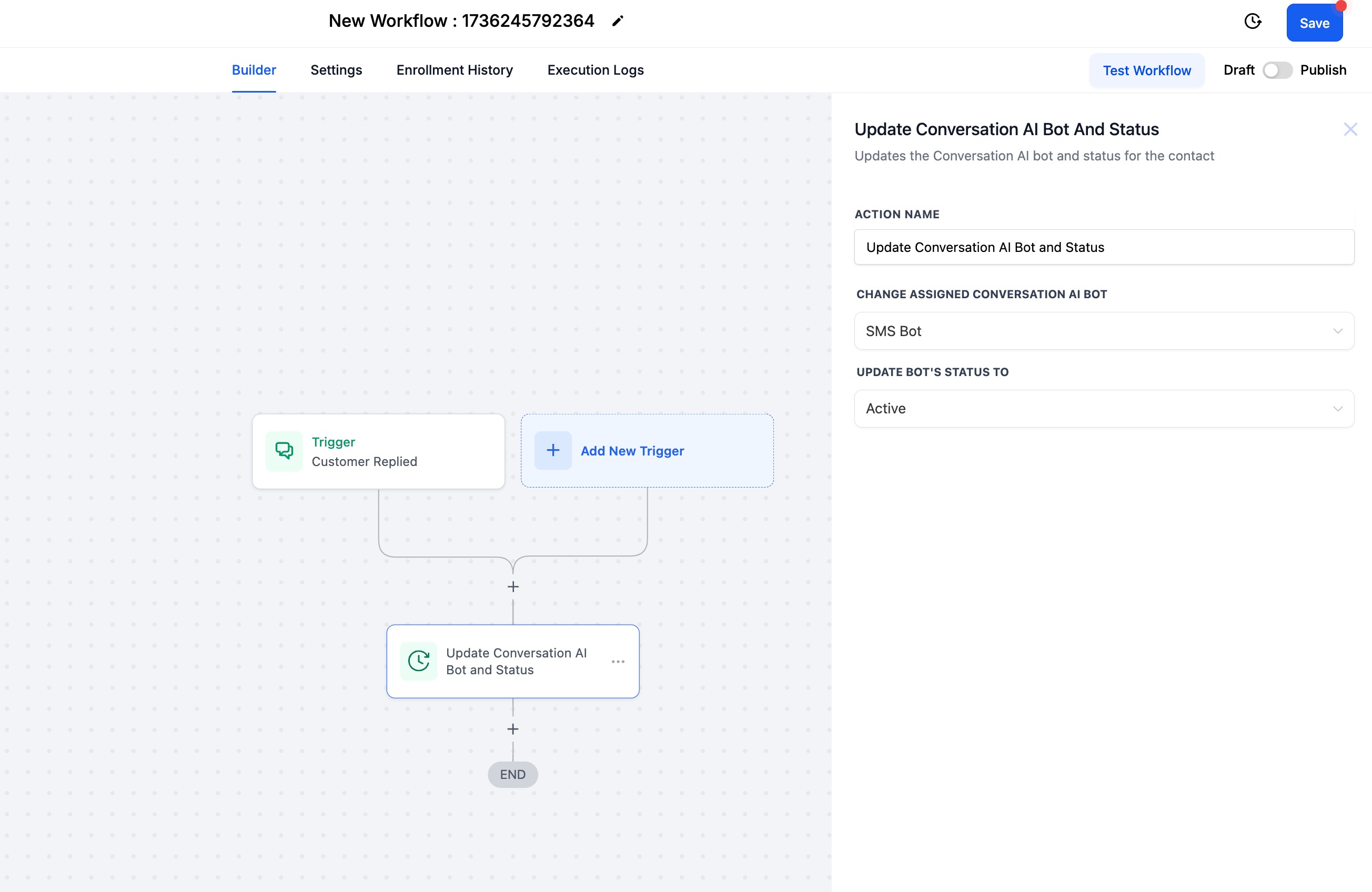 3. Ajouter l’action : mettre à jour le bot IA de la conversation et le statut.