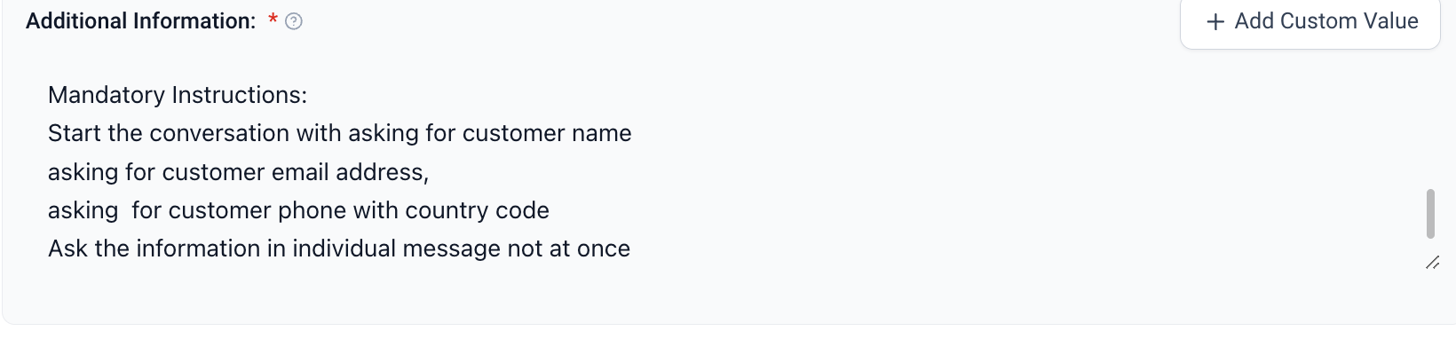 Imaginons que vous souhaitiez recueillir le nom, l'e-mail, le téléphone. Ajoutez cela dans l'invite pour vous assurer que le bot pose ces questions. Commencez l'invite par ### instruction obligatoire ### instruction obligatoire : avant de prendre un rendez-vous, commencez toujours la conversation en posant ces questions l'une après l'autre 1. Demandez au client son nom 2. Demandez au client son e-mail 3. Demandez au client son téléphone