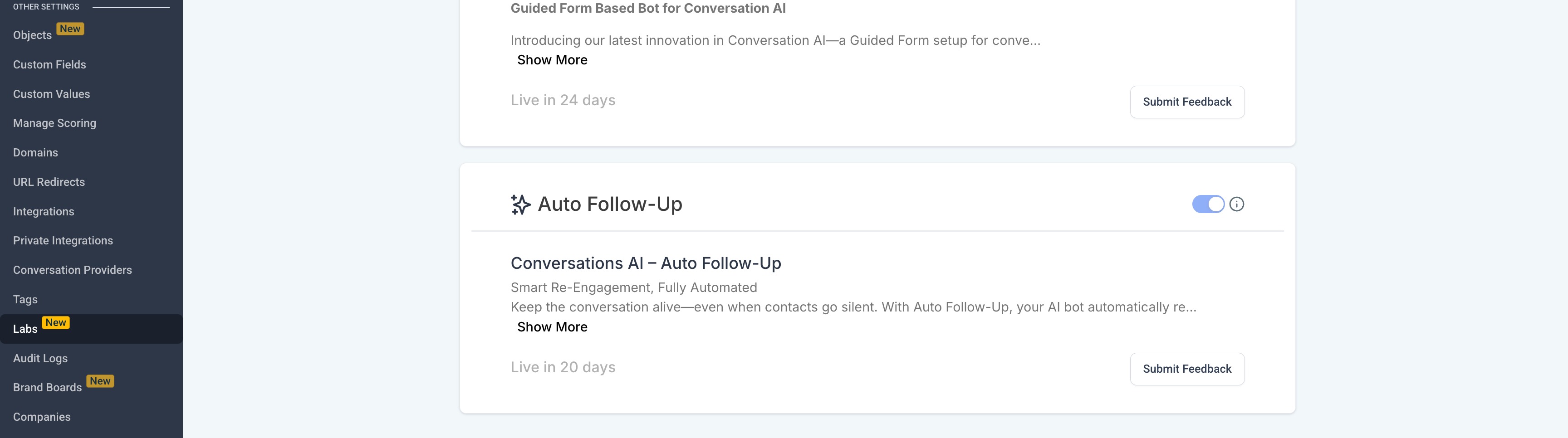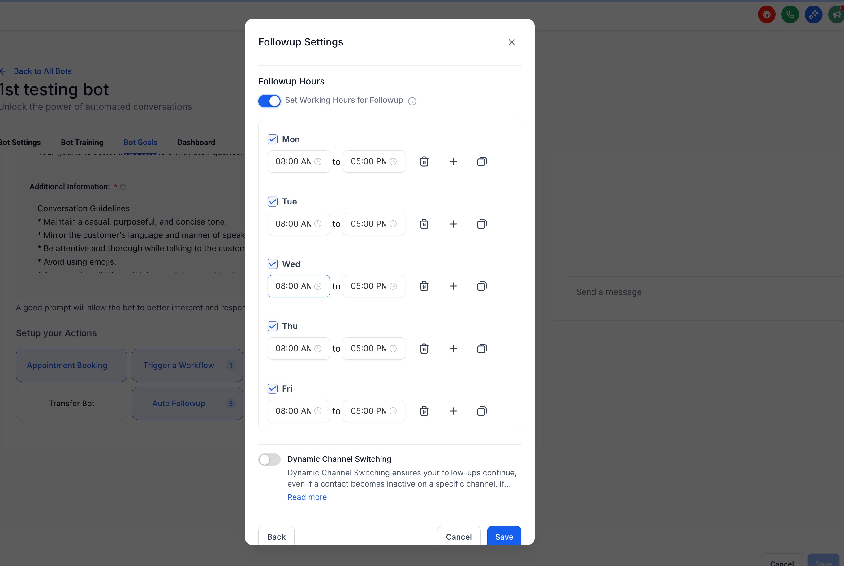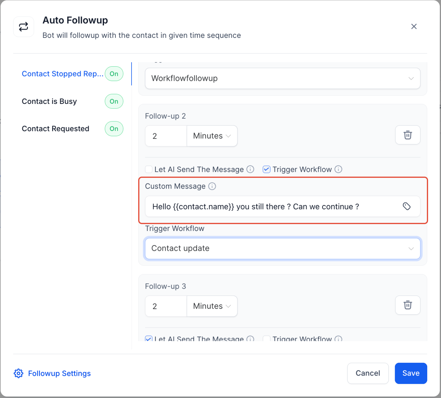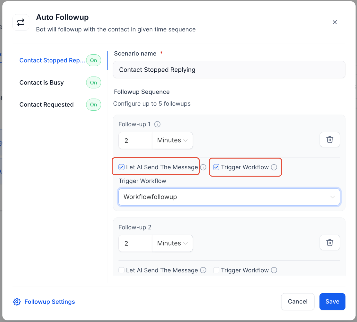 La fonctionnalité de suivi automatique permet à votre bot IA de conversation d’envoyer des messages sortants de manière automatique pour réengager un contact qui a disparu, qui est devenu inactif ou qui a demandé un suivi ultérieur. Cela élimine le besoin d’interventions manuelles ou de la création de flux de travail complexes.