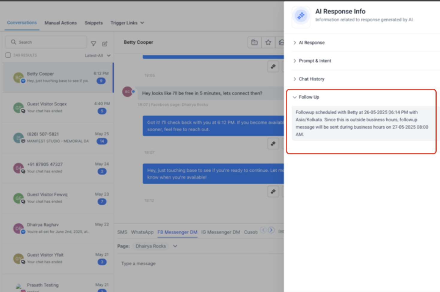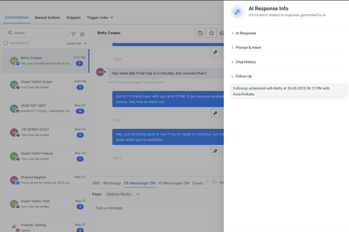 Tous les suivis programmés seront affichés dans le panneau d’informations de réponse pour chaque contact. Cela vous offre une vue claire des moments où les suivis sont programmés et de ce qui les a provoqués.