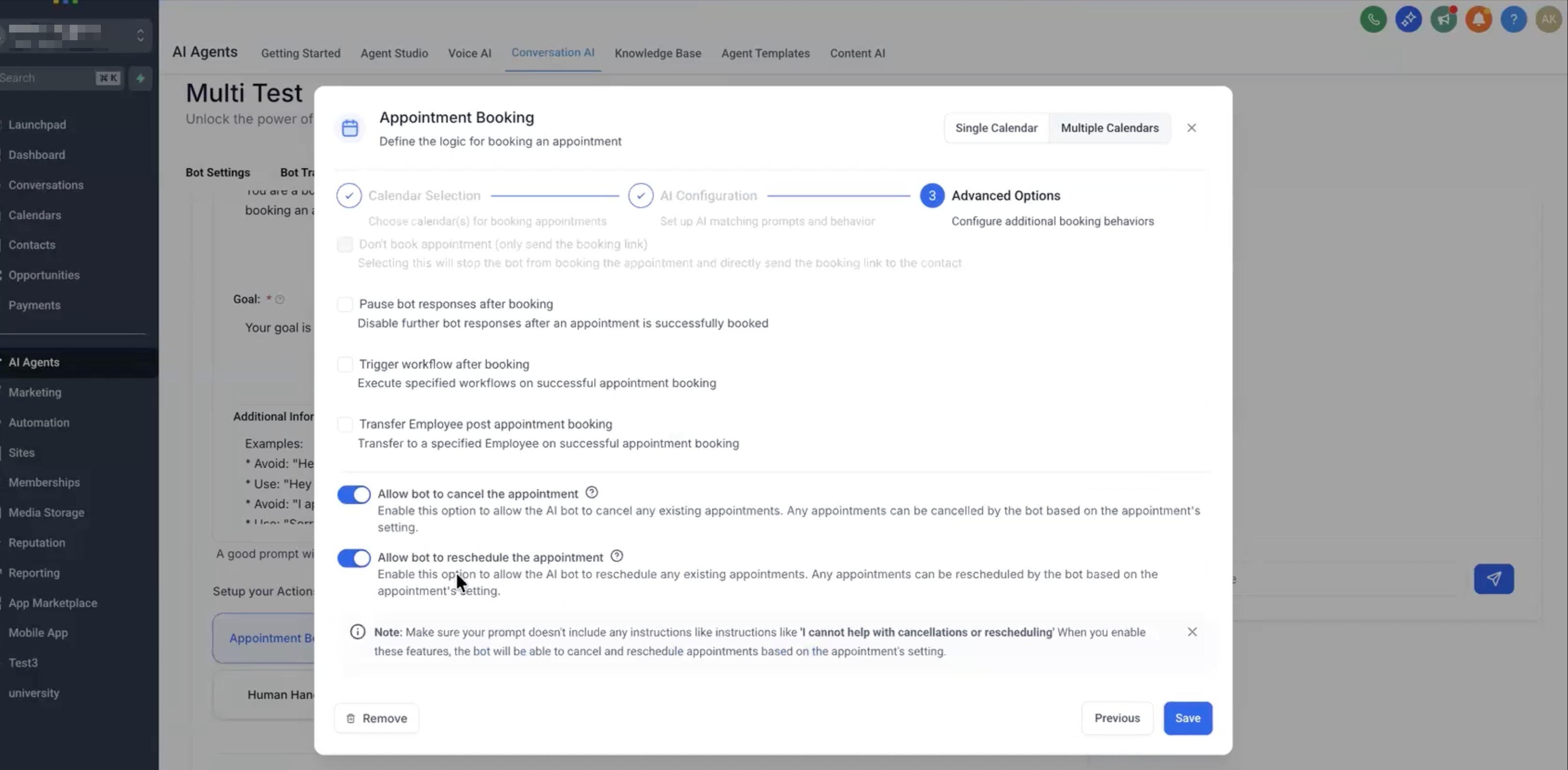 Le support des calendriers multiples donne à votre Bot de Réservation de Rendez-vous IA la capacité de diriger les demandes vers le calendrier approprié en fonction de l'intention du client. Au lieu de restreindre votre bot à un seul calendrier, vous pouvez maintenant configurer plusieurs calendriers — chacun correspondant à un service, un département ou un spécialiste — et permettre à l'IA de choisir automatiquement lequel utiliser.