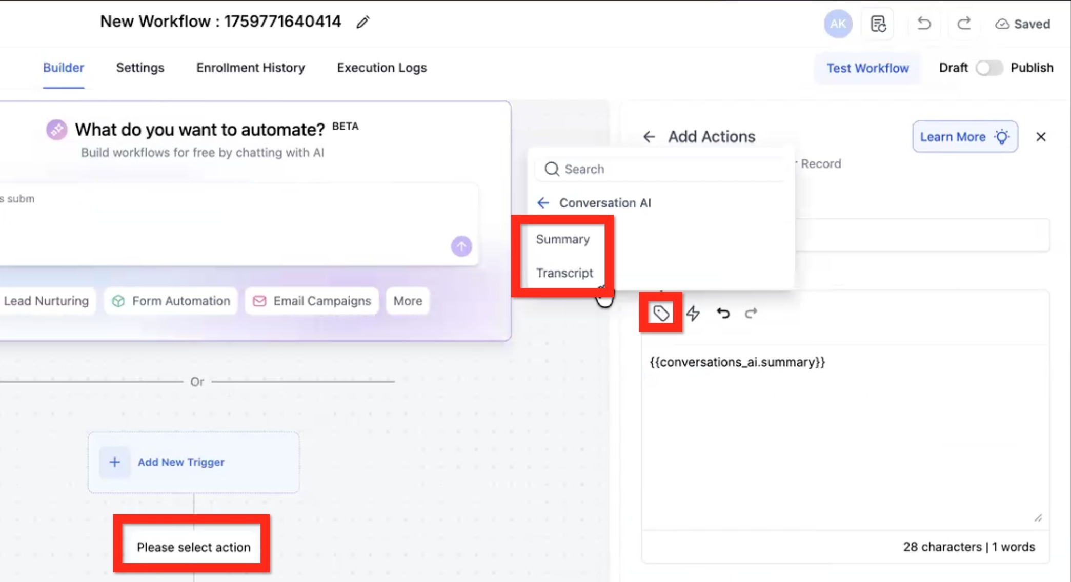 Déclencher un flux de travail - Sélectionnez le flux de travail dans le menu déroulant. Cela est obligatoire si vous souhaitez enregistrer le résumé dans le CRM et que ce flux de travail doit être activé par l'IA de conversation.