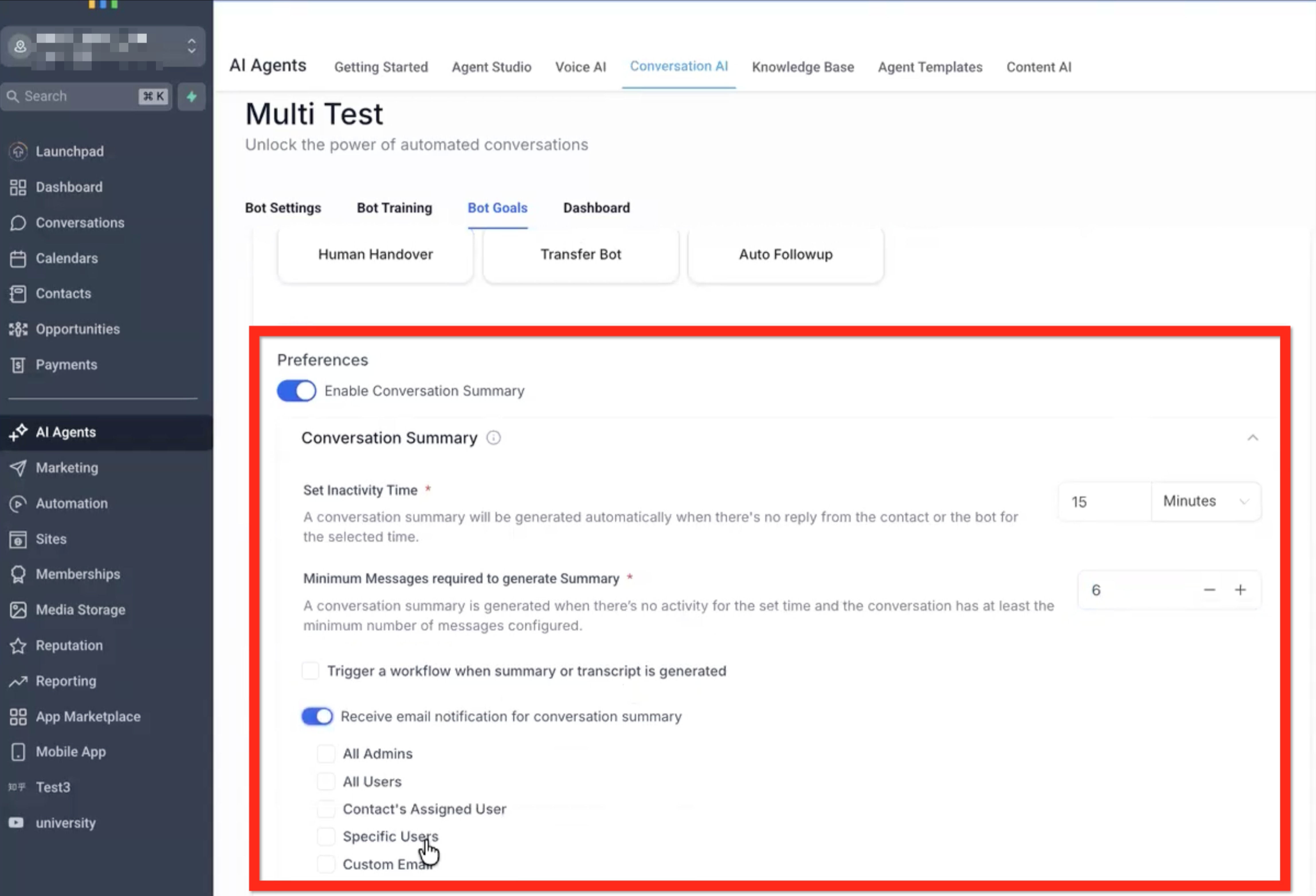 - Dans l'onglet Objectifs du Bot, cliquez sur le bouton pour Activer le résumé de la discussion.
